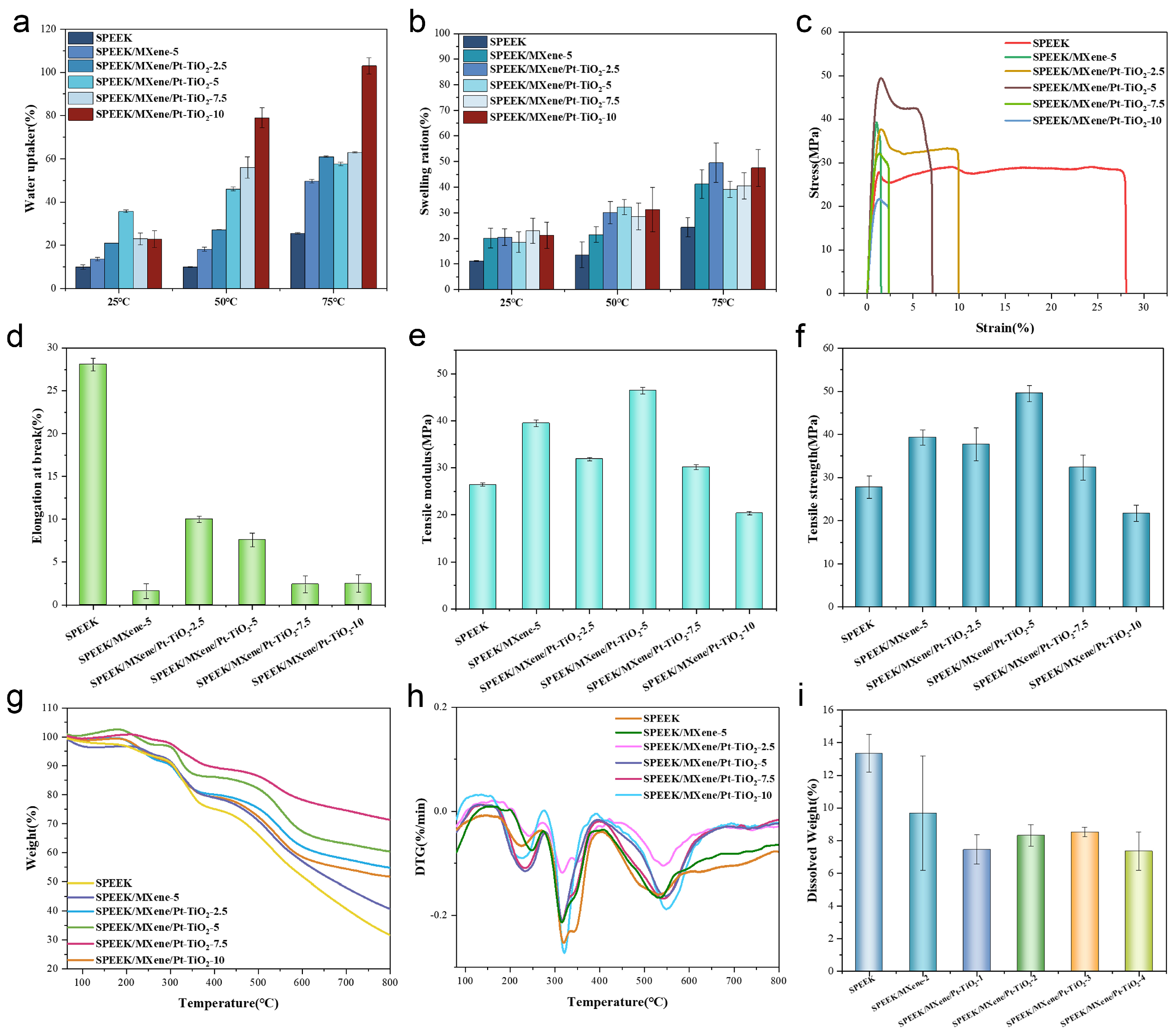 | SPEEK/MXene/Pt-TiO2-5 | 3.76 ± 0.12 | 2.27 ± 0.02 | 8.37 |