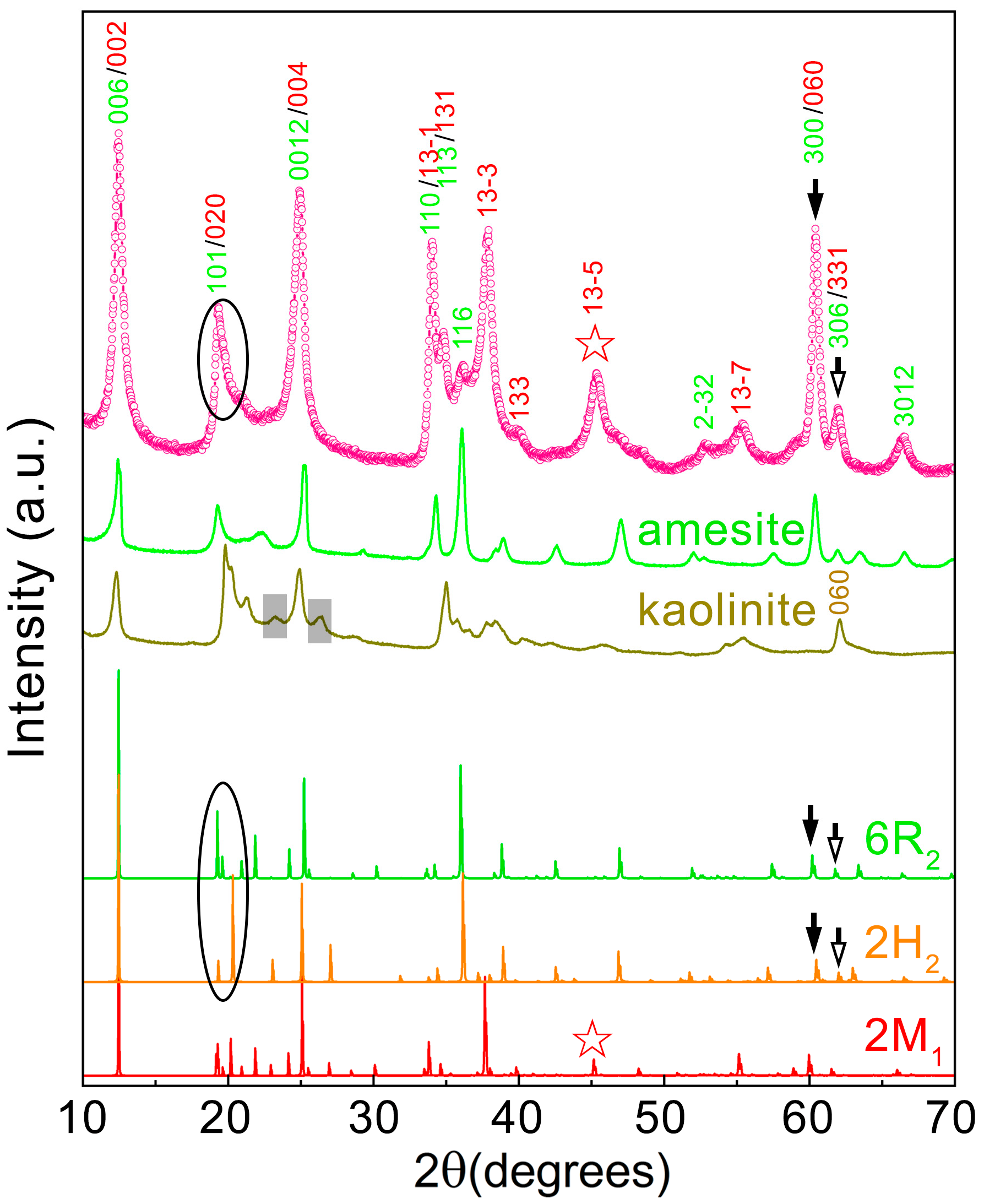 - Zheng, H.; Bailey, S.W. Refinement of an Amesite-2H1 Polytype from Postmasburg, South Africa. Clays Clay Miner. 1997, 45, 301–310. [Google Scholar] [CrossRef]