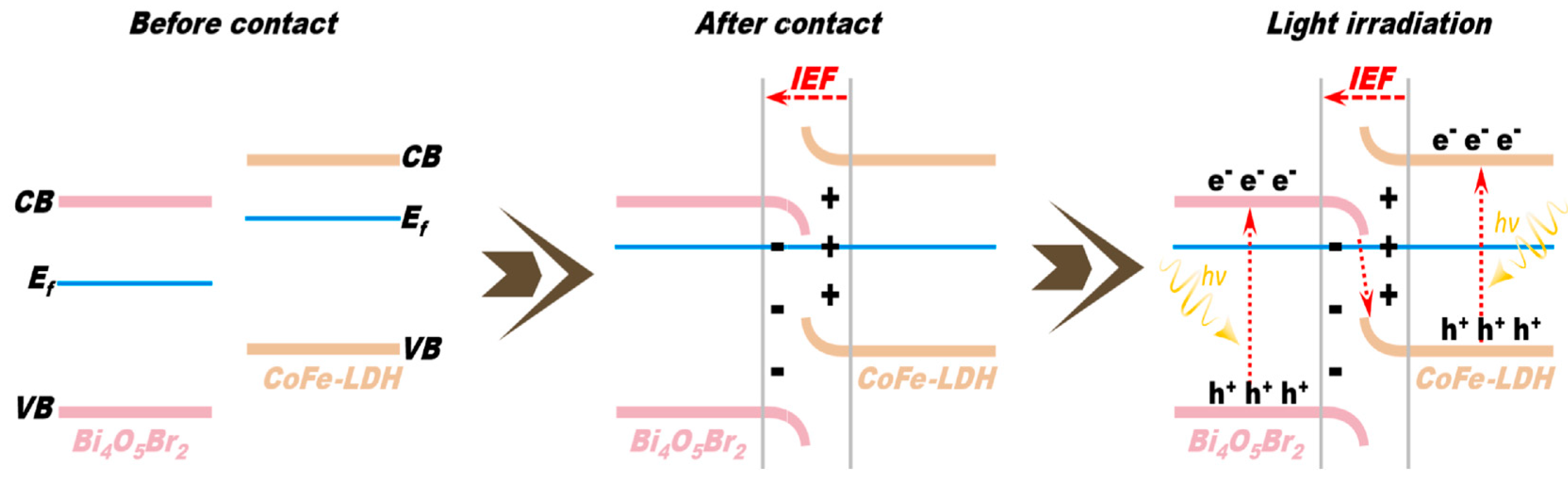 - Pei, L.; Jiang, W.; Ma, H.; Zhao, H.; An, J.; Ma, Y.; Zhan, S.; Zhou, F. Interfacial electric field driven photocatalytic activation of peroxymonosulfate over CoFe-LDH/Bi4O5Br2 for enhanced antibiotics removal across the full pH range. Appl. Surf. Sci. 2025, 692, 162754. [Google Scholar] [CrossRef]