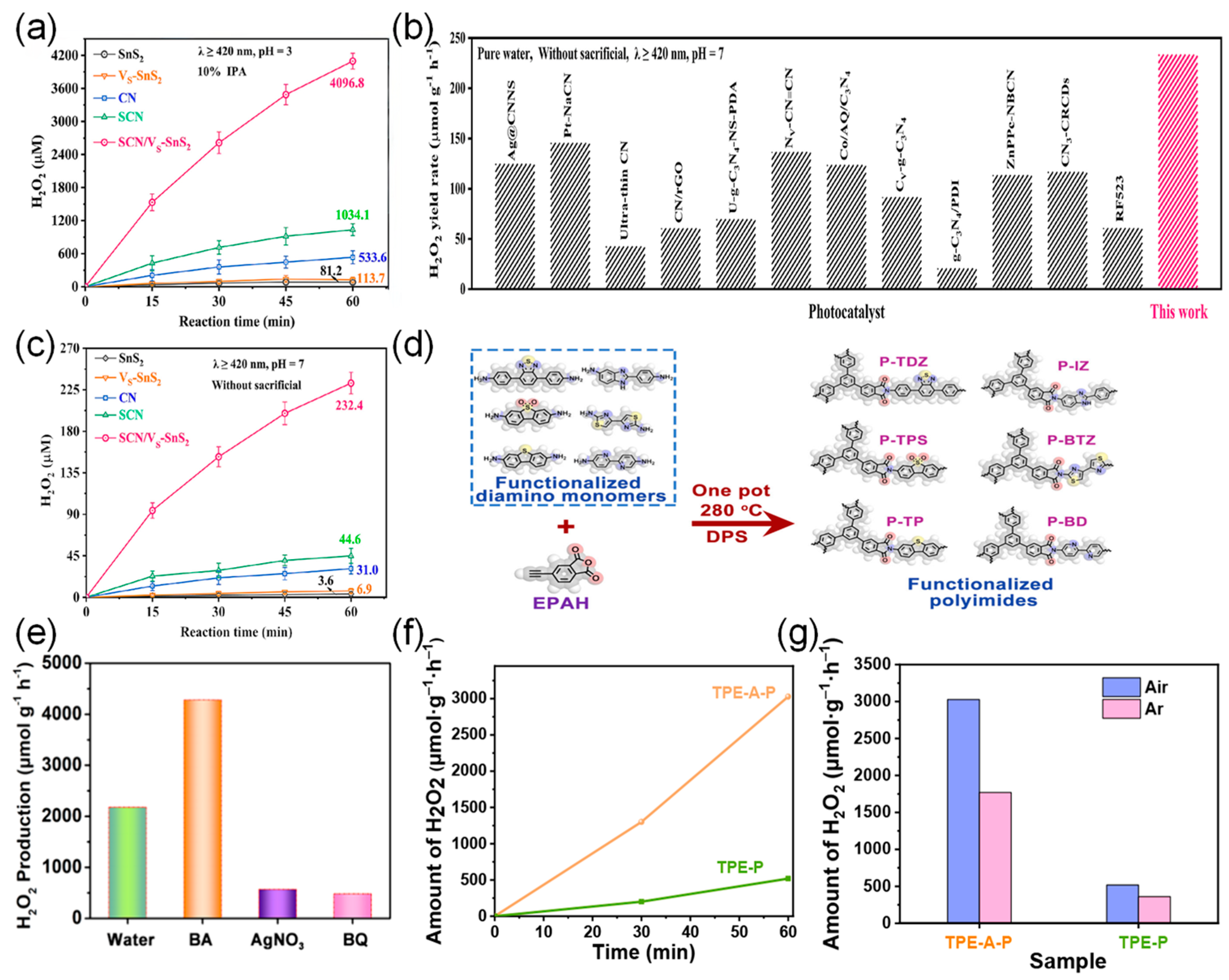 | PI-BD-TPB | H2O | O2 | AM 1.5G | 2.833 | Yield remained stable after long-term cycling | [114] |