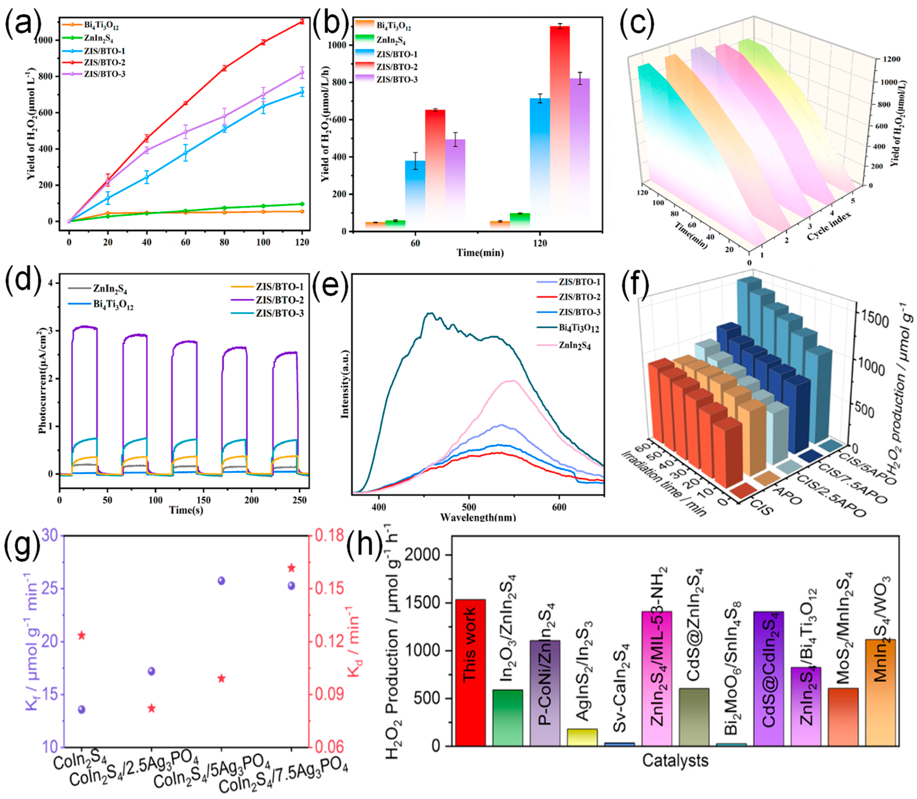 - Fan, H.; Ai, L.; Xu, M.; Wu, S.; Wang, L.; Tan, C. A novel dual-channel ZnIn2S4/Bi4Ti3O12 S heterojunction significantly enhances photocatalytic hydrogen peroxide synthesis. J. Colloid. Interface Sci. 2025, 697, 137896. [Google Scholar] [CrossRef] [PubMed]