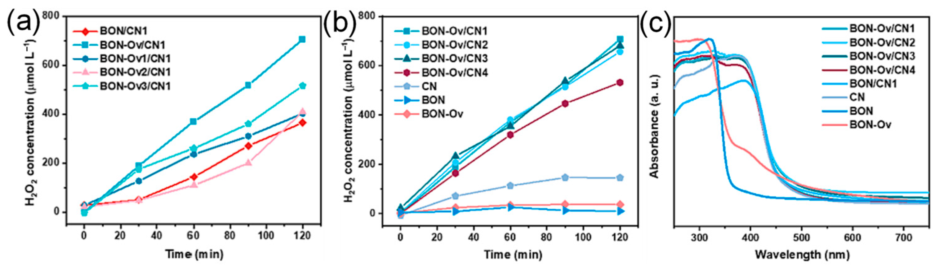 - Li, S.; Dong, G.; Hailili, R.; Yang, L.; Li, Y.; Wang, F.; Zeng, Y.; Wang, C. Effective photocatalytic H2O2 production under visible light irradiation at g-C3N4 modulated by carbon vacancies. Appl. Catal. B Environ. 2016, 190, 26–35. [Google Scholar] [CrossRef]