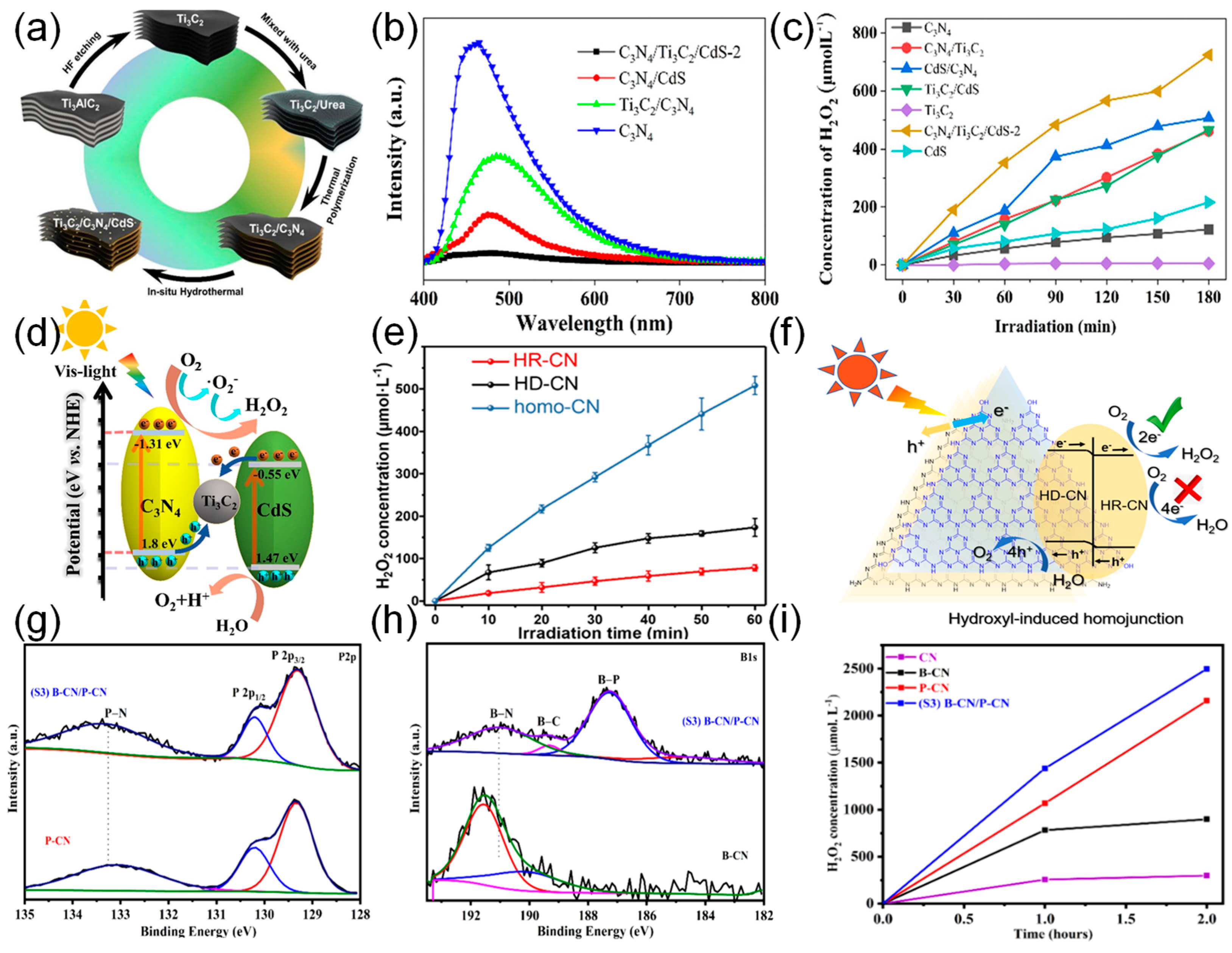 - Cao, J.; Zhou, S.; Cai, J.; Han, J.; Liu, J.; Li, R.; Huang, M. In situ fabrication of Z-scheme C3N4/Ti3C2/CdS for efficient photocatalytic hydrogen peroxide production. Phys. Chem. Chem. Phys. 2023, 25, 25734–25745. [Google Scholar] [CrossRef]