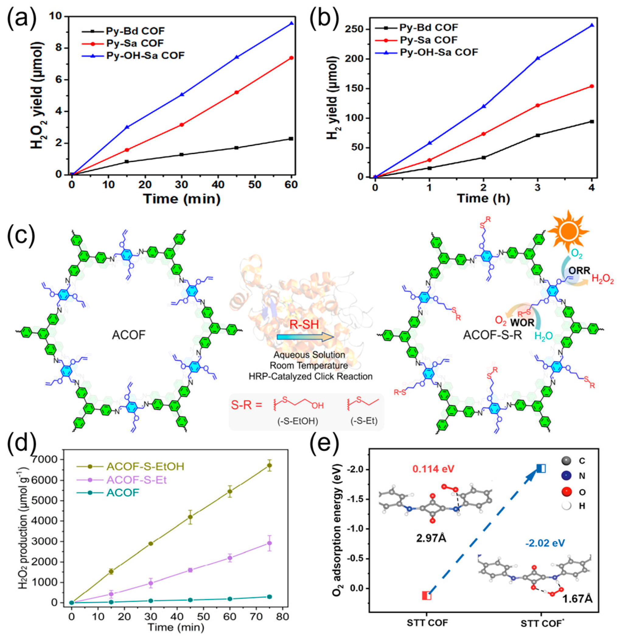 - Zuo, Q.; Chu, B.; Ye, X.; Li, F.; Li, L.; Xu, Q. Enzyme-Click Postsynthetic Modification of Covalent Organic Frameworks for Photocatalytic H2O2 Production. J. Am. Chem. Soc. 2025, 147, 34681–34689. [Google Scholar] [CrossRef] [PubMed]
