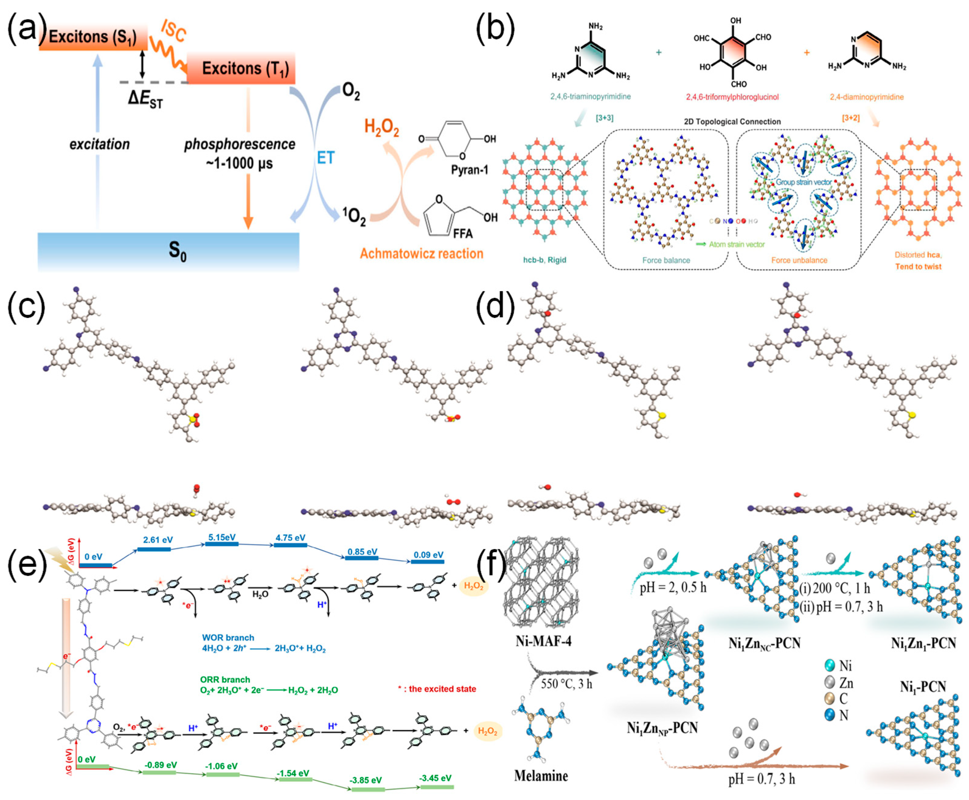 - Huang, C.; Zhang, Y.; Shen, R.; Hao, L.; Qi, B.; Liang, G.; Zhang, P.; Li, X.; Li, X. Triplet Exciton-Enhanced Photosynthesis of Hydrogen Peroxide Enabled by Topologically Tuned Covalent Organic Frameworks. Adv. Mater. 2025, 38, e11092. [Google Scholar] [CrossRef] [PubMed]