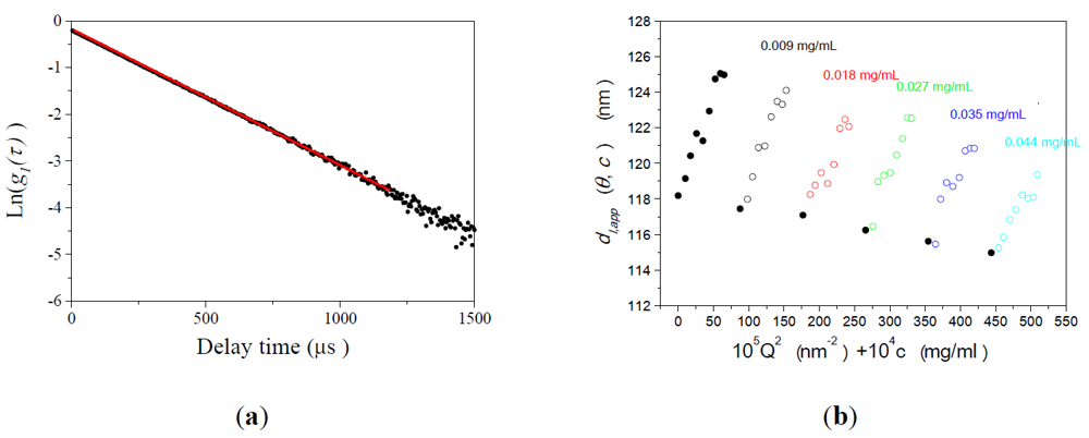 Figure 1a shows an example of the plot of the raw photon correlation function of PS-latex determined by DLS measurement. The concentration of the aqueous suspension of PS-latex was 0.009 mg/mL and light scattering was observed at a scattering angle of 90° in the figure. The filled circles in Figure 1a indicate the raw data, and the red line is the linear least-squares fit with the observed photon correlation function according to Equation 2.