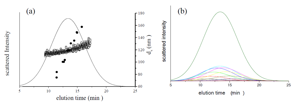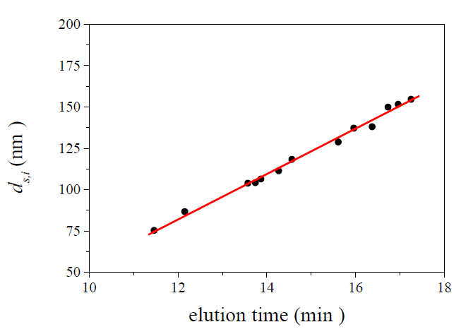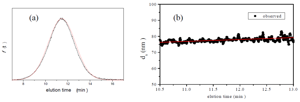 is 11.5 nm from Equation 15. (a) Apparent l ight scattering intensity ( black solid curve) fractogram and fitting curve expressed by Equation 12 (red solid curve). ( b)Apparent diameter of PS-latex (T0625) nanoparticles measured by MALS at corresponding elution times (filled black circles) and theoretical relationship between diameter and elution time (red line) .