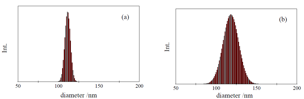 Examples of size distribution for PS-latex nanoparticle suspensions determined by DLS using cumulant analytical method. (a) STADEX SC-0110-D and (b) T0625.