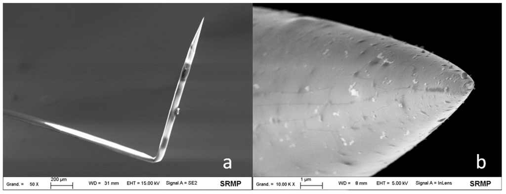 (a) Scanning electron microscopy image of the homemade AFM-SECM-electrode after insulation with electrophoretic paint. Beam energy was 15 kV and working distance 31 mm; (b) Scanning electron microscopy image of the tip apex. The apex radius was around 130 nm. Beam energy was 5 kV and working distance 8 mm.