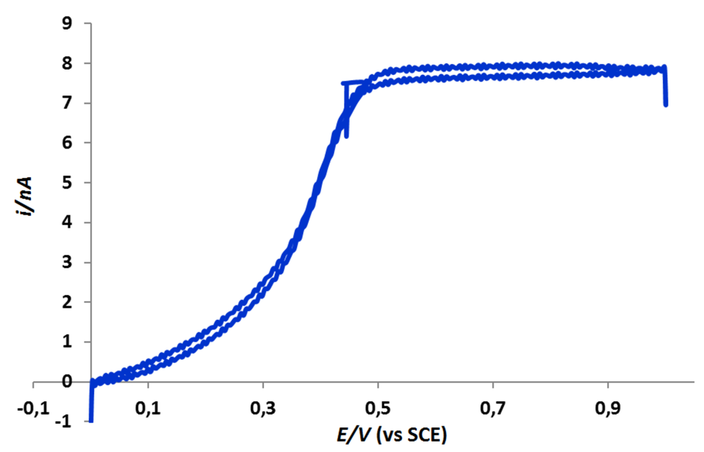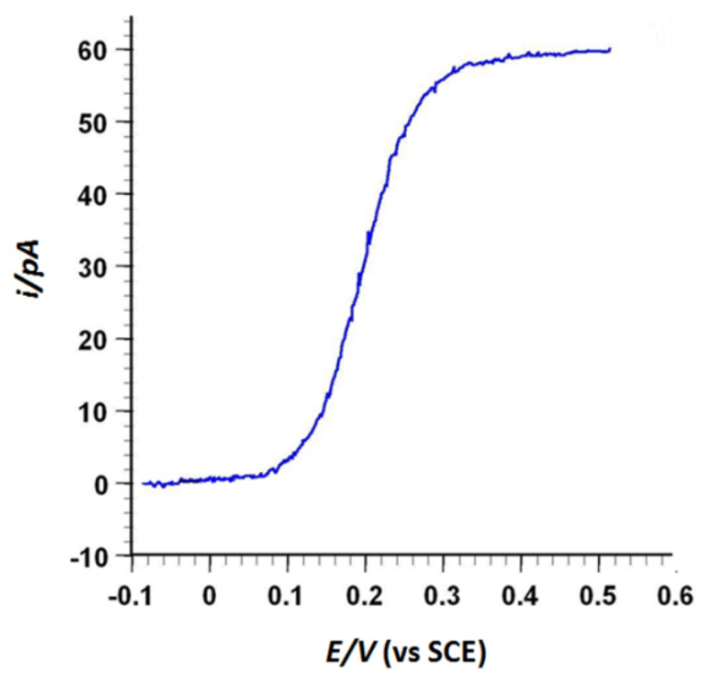 This AFM-SECM-electrode was then characterized by steady-state voltamperometry to get an estimate of the electro-active area of the tip from the limiting current. The well-characterized rapid electron transfer ferrocenedimethanol redox species was used. The typical current-potential sigmoidal curve obtained with an AFM-SECM-electrode is shown in Figure 2.