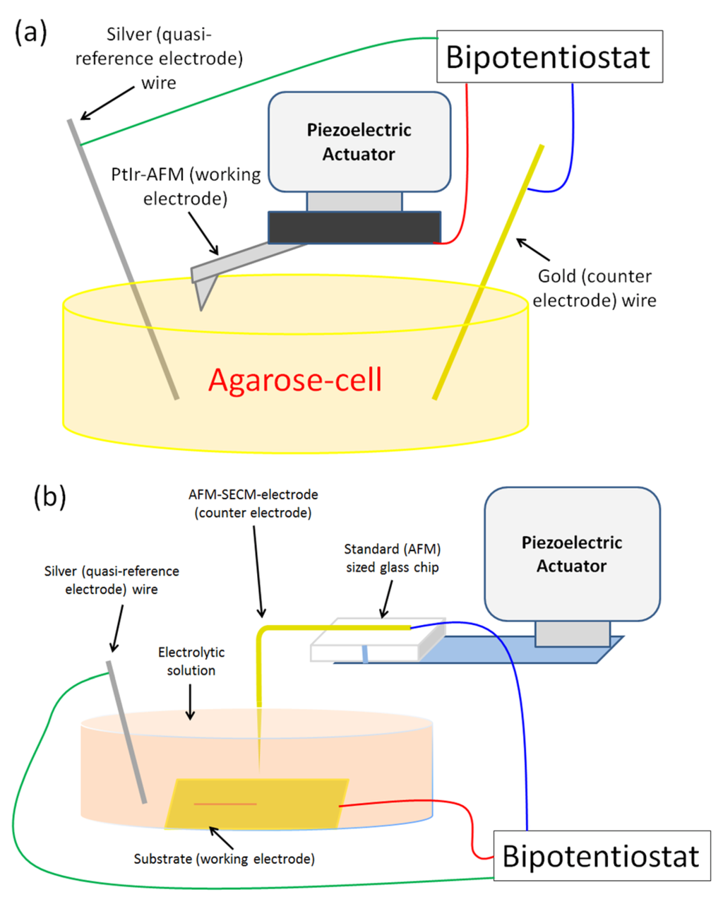 Moreover, there is a lack of information about the technical reproducing of AFM-SECM experiments, which limit the expansion of this promising technique. A unique feature of this paper is that, although there are numerous publications dealing with AFM-SECM combination, few of them insist on the experimental difficulties and details related to the combined technique itself. Thus, here, we not only report mechanisms of the nano-electrografting of organic coatings on a homogeneous substrate and prove the possibility of nano-electrochemical processes onto agar surfaces with the original AFM-SECM combination, but also we insist on experimental precautions related to the electrochemical experiment and probes fabrication. The purpose of this approach is the democratization and the improve of this nano-electrografting technique.