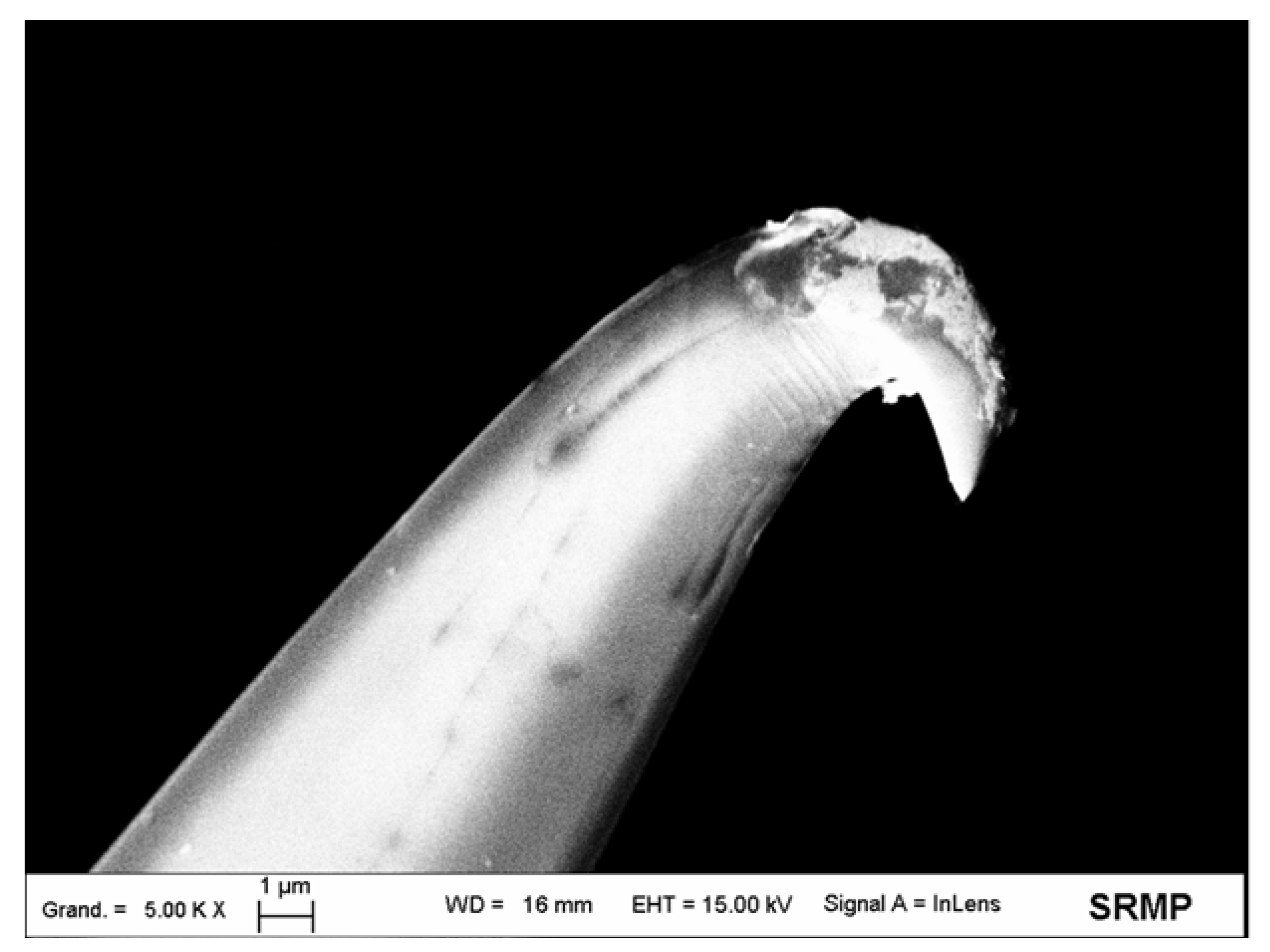 Scanning electron microscopy image of the homemade AFM-SECM-electrode after collision with the surface during nano-electrochemical grafting attempts. Beam energy was 15 kV and working distance 16 mm.
