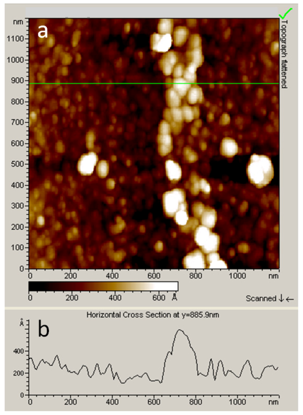 The electro-initiated polymerization technique was thoroughly described in a previous paper [14]. Briefly, it consists in applying a chronoamperometric technique by setting the potential to −0.8 V vs. Ag wire. All the samples were sonicated in ethanol and water before analyses. During AFM-SECM experiments, the tip movement was monitored via the reflection of the AFM laser onto the cantilever arm of the probe and the detection of the reflected beam on a position-sensitive detector. The resulting localized thin films were characterized by topographical AFM analysis (Figure 6). For imaging the localized electrografted trace by AFM in tapping mode, the AFM-SECM-electrode was replaced by a commercial pyramidal Si-tip (mounted on a 225 µm-long single beam cantilever with a resonance frequency of approximately 75 kHz and a spring constant of about 3 N m−1). AFM images were recorded using the retrace signal. The scan rate was in the range of 0.25 Hz, with a scanning density of 512 lines/frame.