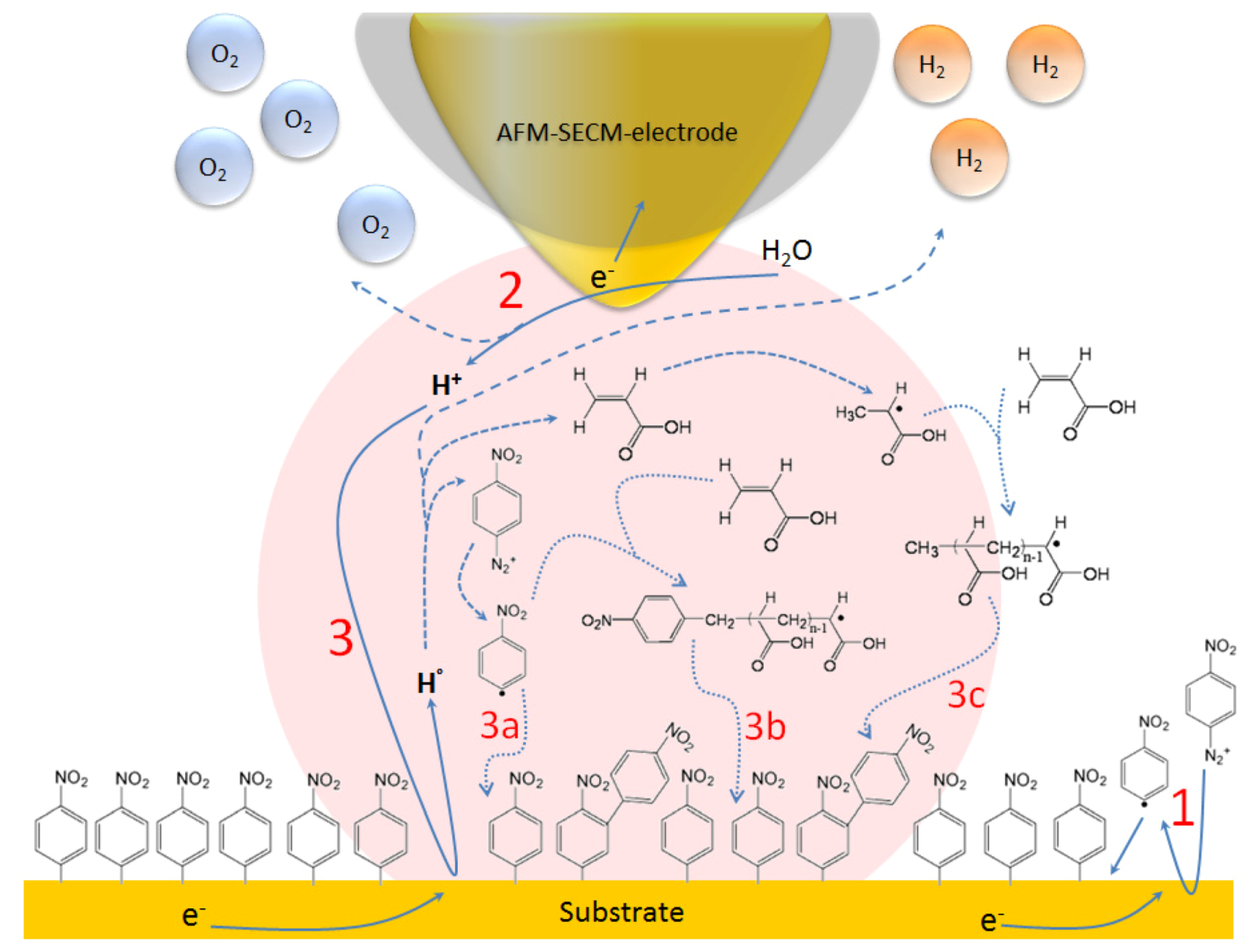 A simplified schematic representation of chemical and electrochemical reactions leading to the line grafting. (1) Reduction of the diazonium salt on the substrate to form a polynitrophenylene-like film; (2) Water oxidation at the AFM-SECM-electrode; (3) Concomitant reduction of protons on the substrate and formation of a localized grafted coating onto the top of the primer polynitrophenylene (PNP) film by radical reaction. (3a) Formation of a phenyl radical and reaction with PNP film; (3b) Phenyl radical initiates the first vinylic (plausible) radical polymerization. Reaction of the formed macroradicals with the grafted layer; (3c) Formation of radical monomer, initiation of the second (plausible) vinylic radical polymerization and reaction of the formed macroradicals with the grafted layer.