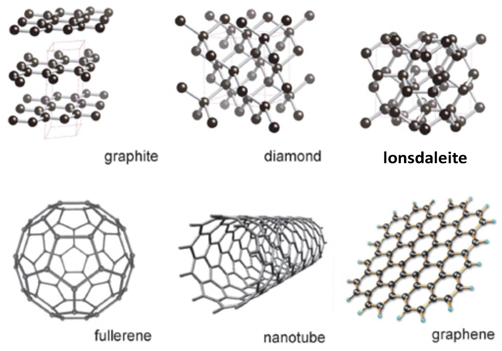The common naturally-occurring sp2 and sp3 allotropes of carbon occur in different crystallographic forms. Graphite: Hexagonal; stacked flat layers of 3-coordinated sp2 C. Diamond: Cubic; framework of 4-coordinated sp3 C. Lonsdaleite: Hexagonal; framework of 4-coordinated sp3 C. Fullerenes: Closed cage molecules sp2 C: C60, C70, C76, etc. Nanotubes cylindrical fibers of sp2 C, single tubes or nested. Graphene: one-atom-thick graphitic layers with sp2 bonding. Reprinted with permission from []. Copyright 2013 Mineralogical Society of America.