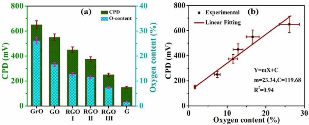 (a) Bar graph of contact surface potential difference (CPD) as a function of oxygen content at different stages in graphene synthesis; and (b) Linear fitting of CPD variation during decreasing oxygen content at different stages from graphite oxide to graphene. Reprinted with permission from []. Copyright 2013 American Chemical Society.