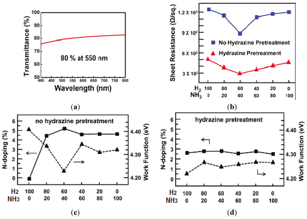 Effect of GO treatment on the properties of GO. (a) Shows increase in transmittance with respect to wavelength and (b) Shows decrease in sheet resistance with respect to hydrazine treatment, whereas (c) Shows percentage of N-doping and work function modulation with no hydrazine pre-treatment, and (d) With hydrazine pre-treatment plotted again H2/NH3 ratio. Reprinted with permission from []. Copyright 2011 American Chemical Society.