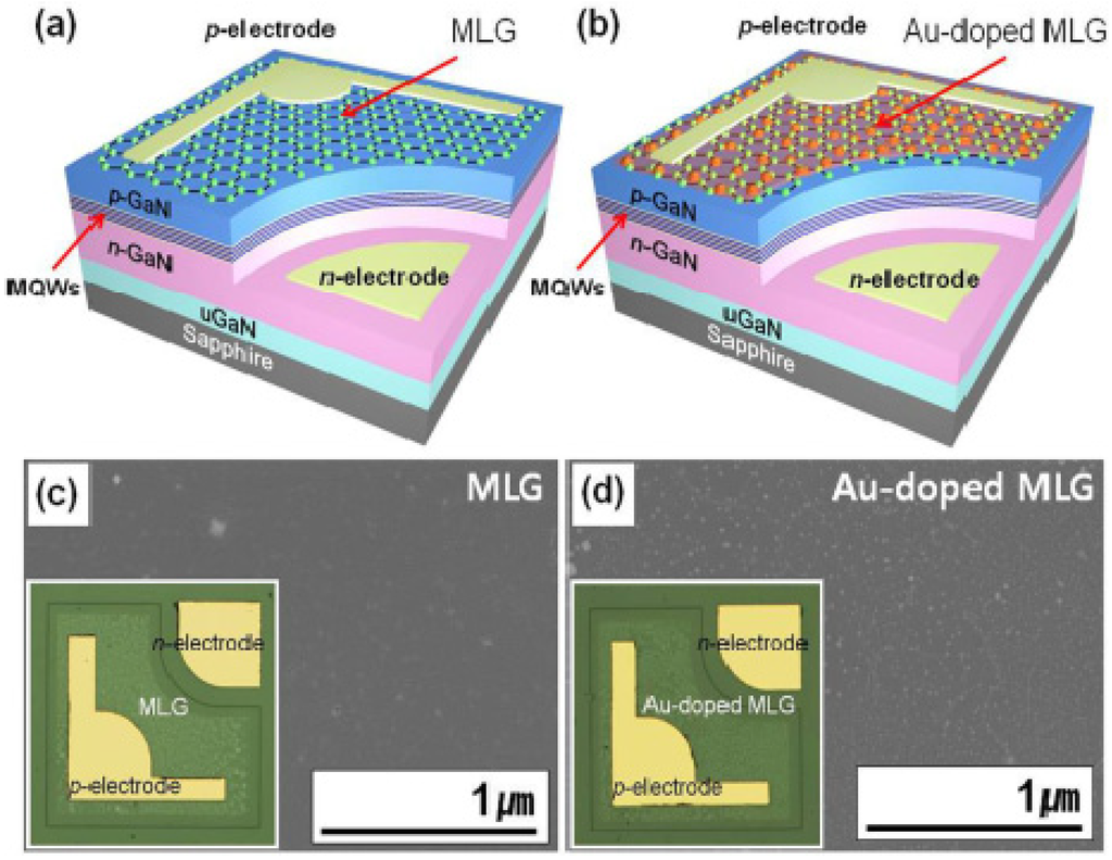 Schematic diagrams of near-ultraviolet light-emitting diodes (NUV-LEDs) with (a) multi-layer graphene (MLG) and (b) Au-doped MLG TCLs; (c) SEM images of MLG and (d) Au-doped MLG. Reprinted with permission from []. Copyright 2013 AIP Publishing.