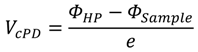The wet chemical method based on oxidation of natural graphite to graphite oxide (GO) followed by exfoliation to graphene oxide, and finally thermal/chemical/electrochemical reduction of GO to reduced graphene oxide (r-GO) is one of the most widely used protocols for large scale synthesis of graphene/r-GO. This method, however, introduces different oxygen containing functional groups to graphene. The type and concentration of such functionalities have a decisive influence on the WF of graphene. For example, incorporation of electron withdrawing groups such as –OH to the surface of r-GO increases the WF; whereas, the addition of electron donating group (e.g., –CH3) to the surface decreases the WF []. Kumar et al. [] recently thoroughly examined the impact of oxygen-containing chemical functionality on the WF of rGO using classical molecular dynamics simulation and density functional theory on a set of realistic rGO structures. From such an exercise, it was predicted that the presence of carbonyl groups on the rGO surface results in the largest impact on WF (6.7 eV) relative to all other groups. It has been demonstrated that the presence of such a group can induce a WF value of ~60% higher than that of pristine graphene (4.2 eV). On that basis they projected a significant tunability in the WF of rGO (up to ~2.5 eV) by altering the composition of the oxygen-containing functional groups (Figure 6). Mishra et al. [] experimentally evaluated the WF of GO as a function of oxygen content. They employed contact surface potential difference (CPD) estimation as an indicator of WF using a scanning Kelvin probe method (SKPM). SKPM, is a scanning probe method, where, a vibrating capacitor is used to investigate the WF of metal and semiconductor surfaces at nano/micro level; and provides information about the electronic state of the local structures on the surface of a solid. In principle it is based on the detection and dynamic compensation of the electrostatic forces that arise between the micro/nano tip and the surface when they are electrically connected []. CPD measurement estimated WF indirectly in terms of relative surface contact and may be converted to an absolute value by the appropriate calibration. The CPD measurement between two different surfaces follows the relation: