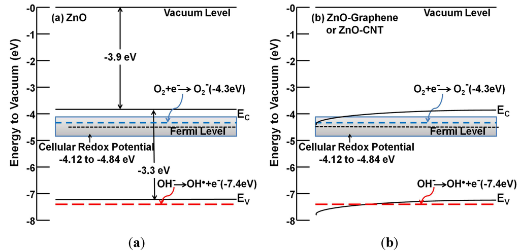 Bandgap energetics diagram of (a) ZnO and (b) ZnO-graphene or ZnO-CNT NH. The diagrams also show the relative energetic positions of the cellular redox potential (−4.12 to −4.84 eV) and relevant oxygen species (superoxides and hydroxy radicals).