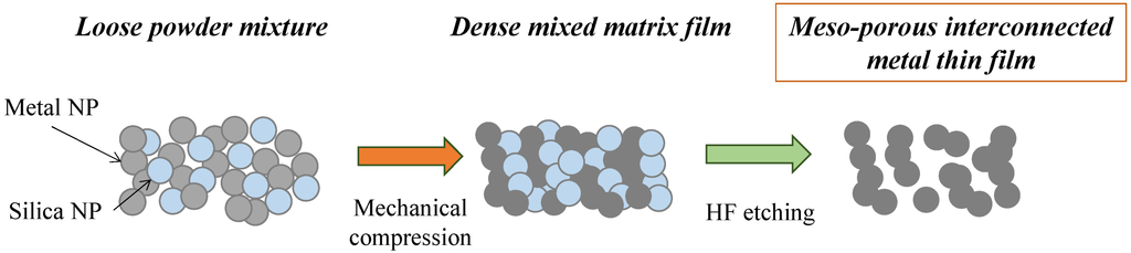 Meso-porous pure silver and copper metal thin film materials were processed for the first time by selective etching of a silica based sacrificial template. The novel meso-porous materials were shown to exhibit homogeneous pore size distribution, porosity and specific surface area closely related to the content in silica of the composite film before etching. Discrepancies in pore size distributions were attributed to phase separation during powder pouring within the die and potential particle aggregation upon cold-pressing. Furthermore, it was demonstrated that full metal NP sintering can be achieved at room temperature only upon pressure application, opening the route to the controlled coalescence of NPs. Other template materials such as lyotropic crystals or polymeric beads could also be used as sacrificial materials to form complex 3D metal frameworks. Also the surface functionalization of the metal NPs could facilitate mixing with the silica template and lead to more ordered and stable meso-structures. Meso-porous metal materials, due to their high surface energy and high specific surface area, offer great promise for application in filtration, catalysis and sensing.