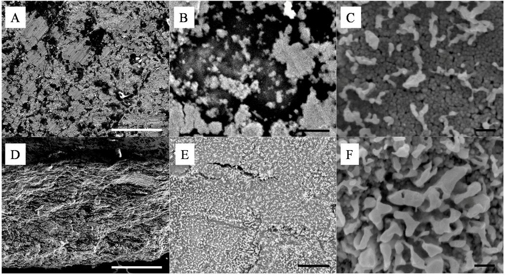 Representative SEMs of the silica - silver cold-pressed composites at 20 ton·m−2; (A–C) are surface and (D–F) cross section images of a 10 wt% silica content composite. The scale bars of (A,D), (B,E) and (C,F) respectively represent 100 μm, 1 μm and 100 nm.
