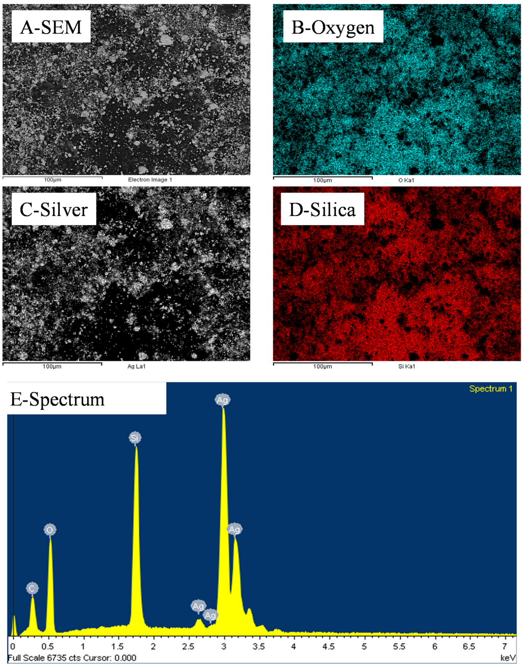 The size of the surface clusters was found by SEM analysis to range, across all studied samples, between 500 nm and 2 μm (Figure 2A). Interestingly, the clusters seem to be larger on the surface of the material than across its thickness as seen in Figure 2E,F. There, after cold-compression, the average size of the clusters was found to be reduced to approximately 100 nm, corresponding to the agglomeration of ~5 Ag NPs. It is clear from these cross section micrographs that the size of the corresponding silica clusters is also close to the same dimensions, with up to 1012 silica NPs per cluster. This particle distribution was confirmed by energy dispersive spectroscopy (EDS) mapping (Figure 3) where the clusters could be clearly attributed to either nearly pure Ag or SiO2. Furthermore small angle x ray scattering (SAXS) analysis of the samples before etching shows a large particulate distribution between 5 and 35 nm characteristic of the SiO2 particles and small clusters (Figure S2).