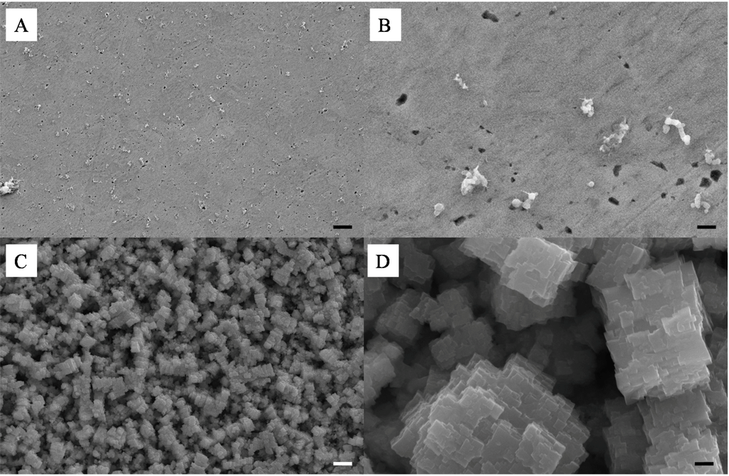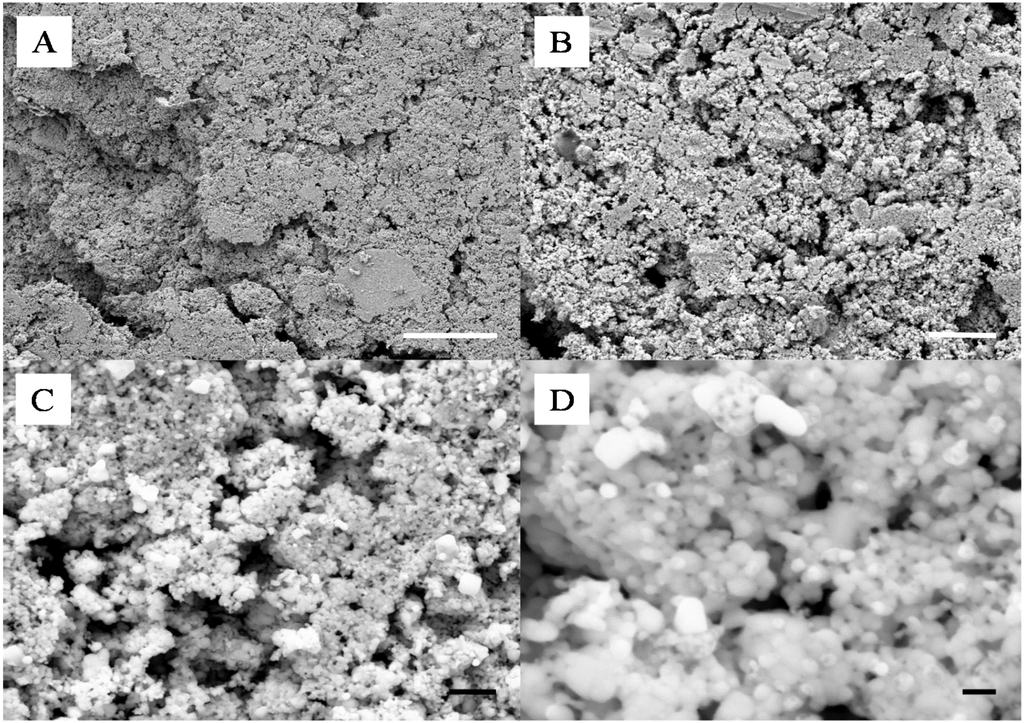 Representative SEMs of the surface of an etched 10 wt% SiO2-Ag composite similar to those presented in Figure 1; scale bars of (A), (B), (C) and (D), respectively correspond to 100 μm, 10 μm, 1 μm and 100 nm.