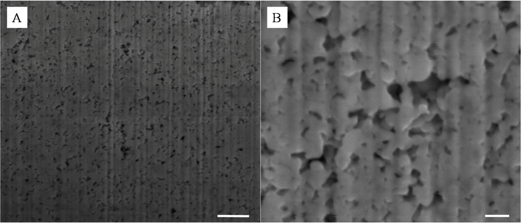 Representative SEMs of the cross-section of an etched 10 wt% SiO2-Ag composite; scale bars of (A) and (B) are 1 μm and 200 nm respectively. The images were taken approximately 10 μm from the surface.