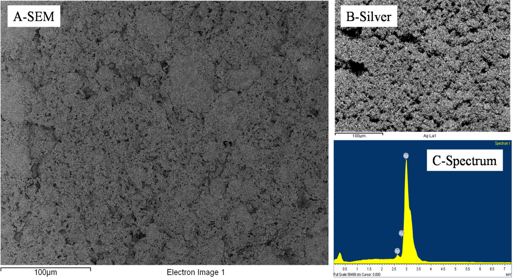 Representative EDS distributions of Si, Ag and O elements across a 10 wt% silica content cold-pressed composite before silica etching presented in Figure 1—carbon is present due to the sputtering step for sample preparation for SEM imaging.