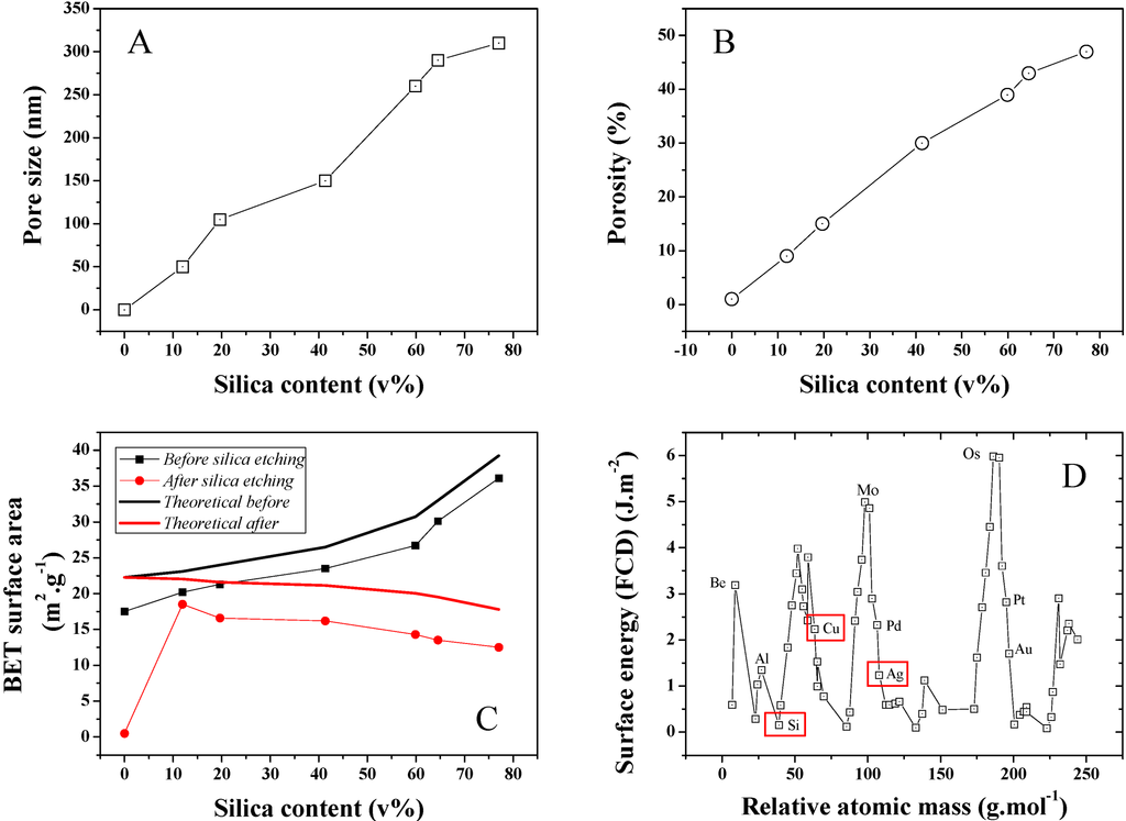 (A) Average pore size distribution obtained for the series of Ag-Si nano-composites after Si etching; (B) Average porosity for the same series; (C) BET surface area for the series of samples before and after etching and theoretical BET surface area calculated for an estimated individual surface area of the Si and Ag NP powders of 23.81 and 30 m2·g−1. The surface area of the cold press sample at 0 wt% of SiO2 was extremely low and thus 0 due to strong particle coalescence; and (D) FTD calculated surface energy for the main elements of the periodic table and visual representation of the position of Si, Cu and Ag. The 0 wt% silica data points for pore size and porosity were extrapolated since no data could be obtained neither by perm-porometry nor pyknometry.