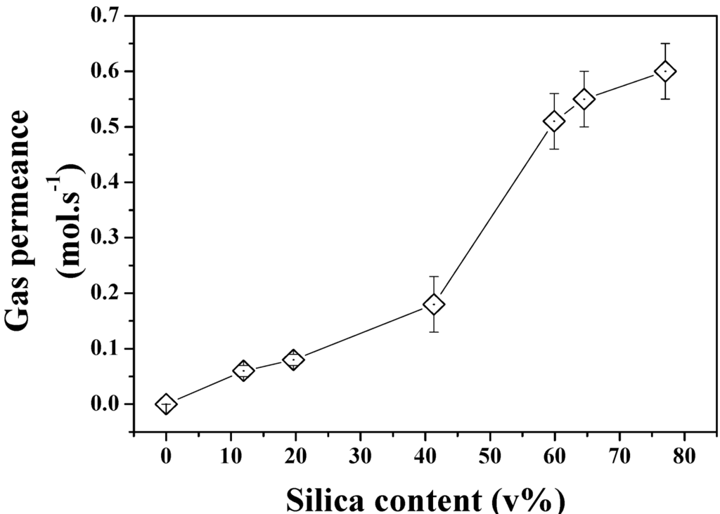 The gas permeation properties of the same series of samples were also investigated to demonstrate the formation of true through pores across the structures. As seen in Figure 8, the increasing pore size and porosity lead to enhanced gas permeation. Interestingly, a stronger shift was found to occur between 40 and 60 SiO2 v% content in the powder beds which could be related to the formation of larger defects on the edge of the samples or to macro voids across the materials which cannot be otherwise characterized by direct pore size or porosity measurements. The break-up of the gas permeation at this level could be related to localized inhomogeneity of the materials and variations of relative pore size and porosity despite the care taken in both sample preparation and tests. The relationship between pore size and gas permeation is expected to be linear for this regime of diffusion at constant porosity. However the increasing porosity directly related to pore size and demonstrated in Figure 7 may affect this trend and lead to non-linear gas permeation regimes due to great variations of structures between the samples. Further analysis of the formation of the clusters and pores upon etching for Ag are required and shall be carried out in order to process narrower pore size distribution materials and process materials with fixed porosity and ranging pore size distributions.