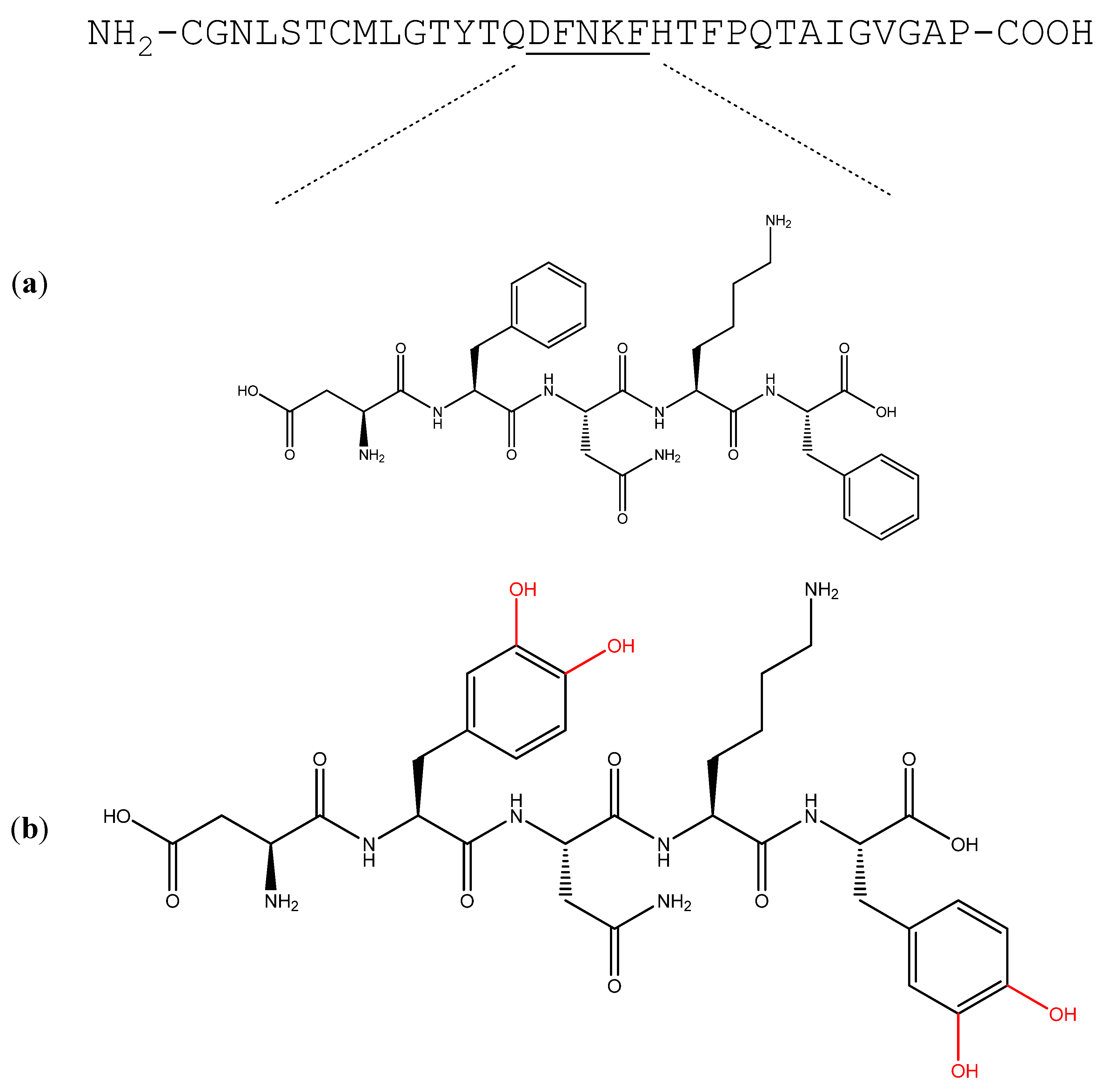 Self-assembly of amyloid-like structures has been a subject of much interest in nanobiotechnology. Due to their ability to self-assemble into ordered nanostructures that may also be chemically and biologically functionalized, amyloidogenic peptides are regarded as promising building blocks for various nanobiotechnological applications [24,25,26,27,28,29,30,31,32]. Pertinent to this is functionalization by the catechol group. This functional group can take part in diverse chemical interactions including hydrogen bonds, metal-ligand complexation, Michael-type addition, π–π interactions and quinhydrone-type charge-transfer complexation [33,34]. Adhesive properties were demonstrated by catechol-incorporated materials which were used as binding agents for both organic and inorganic surfaces [35,36]. The non-coded L-3,4-dihydroxyphenylalanine (DOPA) amino acid, containing the catechol group, has been incorporated into synthetic polymers which, by utilizing the redox activity of the catechol group, were used for the preparation of antifouling surfaces [37], metal nanoparticles [38] and antimicrobial films and hydrogels [39,40]. Recent studies have reported the self-assembly of DOPA-containing building blocks into nanometric fibers [41,42] and the unique functionality of such assemblies has been demonstrated [43]. Here, a short synthetic peptide, the minimal amyloidogenic recognition module of hCT, was designed to contain two DOPA moieties, substituting the phenylalanine residues, resulting in a unique building block, the Asp-DOPA-Asn-Lys-DOPA pentapeptide (Figure 1). This pentapeptide retained the ability to spontaneously self-assemble in vitro into amyloid-like fibrillar assemblies in water. The obtained assemblies displayed structural properties characteristic of amyloids as well as characteristics of DOPA-containing polypeptides. Functional assessment of the assemblies suggested redox activity and demonstrated the applicative potential of this novel nanobiomaterial.