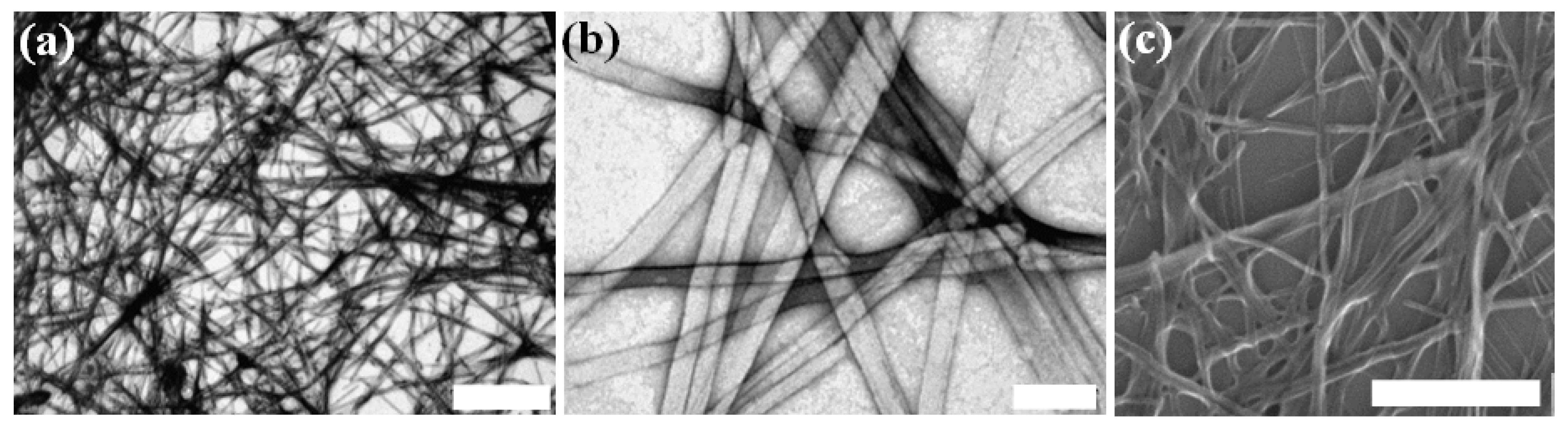 The DOPA-containing peptide Asp-DOPA-Asn-Lys-DOPA assemblies. High-resolution microscopy of fibrillar assemblies formed by 6 mM Asp-DOPA-Asn-Lys-DOPA in water. (a,b) Transmission electron microscopy (TEM) micrographs, negative staining was applied; Scale bars represent 2 µm and 100 nm; (c) scanning electron microscopy (SEM) micrograph, scale bar represents 1 µm.