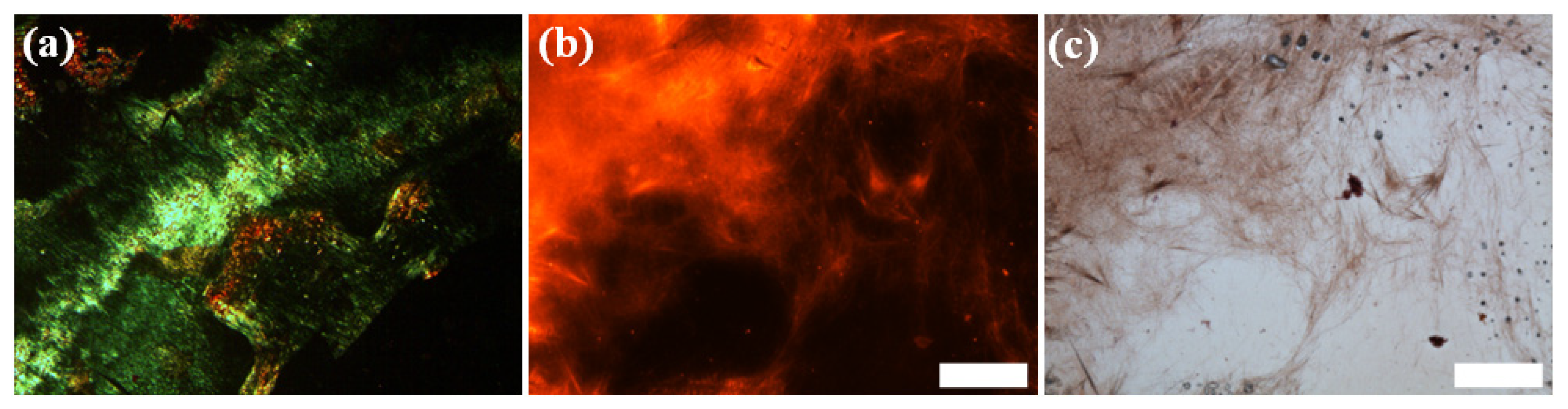- Howie, A.J.; Brewer, D.B. Optical properties of amyloid stained by Congo red: History and mechanisms. Micron 2009, 40, 285–301. [Google Scholar] [CrossRef]