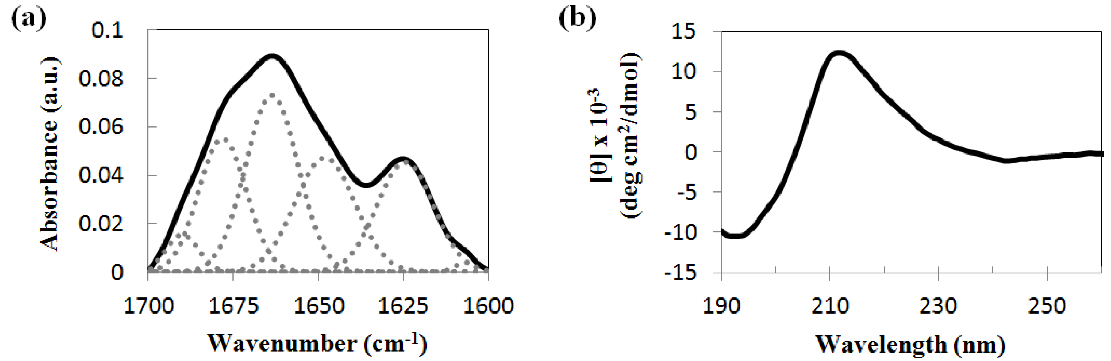 Secondary structure analysis of Asp-DOPA-Asn-Lys-DOPA. (a) Fourier transform infrared (FTIR) spectrum of dried 6 mM solution sample. The spectrum was analyzed by curve-fitting the second derivative of the amide I’ region; (b) circular dichroism (CD) spectrum of 3 mM solution at 25 °C.