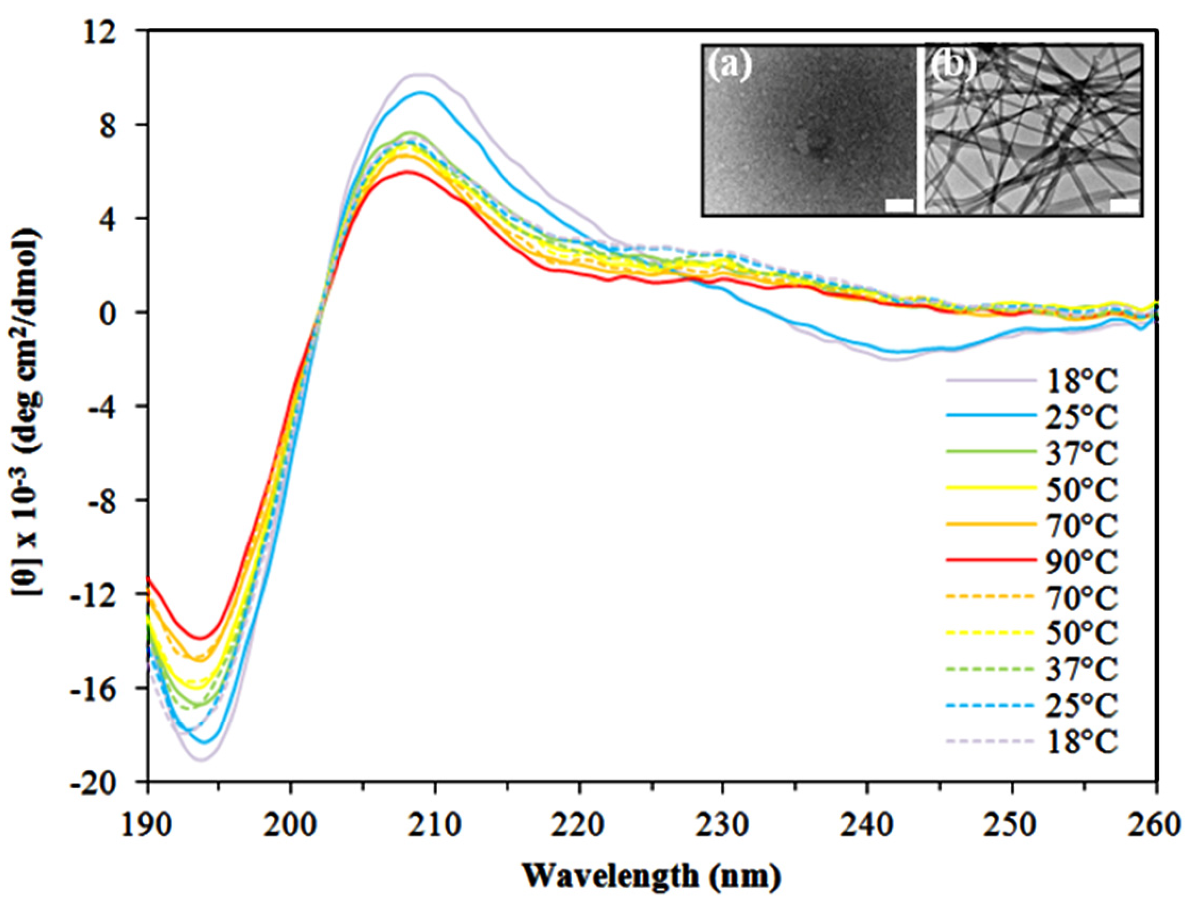 To further elucidate the structural properties of Asp-DOPA-Asn-Lys-DOPA, temperature-dependent CD was performed. Freshly made 6 mM peptide solutions in water were diluted to a final concentration of 0.15 mM and CD spectra were collected during a stepwise increase in temperature from 18 to 90 °C and a subsequent stepwise decrease to 18 °C. Throughout this process, the spectral profile retained its distinct features (Figure 5a). However, intensity loss was observed as the temperature increased, with a significant loss occurring near the ~210 nm positive peak and in the 235–250 nm negative region. This effect seemed irreversible as only minor intensity gain was observed upon the subsequent temperature decrease and suggests a lower content of β-turn structures or possibly a deformation of the turn structure due to temperature elevation. The increase in temperature has also led to intensity loss in the 195 nm band, which regained its intensity during the subsequent temperature decrease; this reversible change can be explained in light of a temperature-dependent change in the backbone rigidity of random coil structures, which is linked to the effective length of the spectroscopic unit [61]. In a subsequent TEM examination of the heated and cooled solution, characteristic fibrillar assemblies were not observed (Figure 5, inset a). In contrast, a control solution which was incubated at room temperature contained the characteristic assemblies (Figure 5, inset b). The absence of assemblies following temperature elevation seems irreversible, at least during the experimental timeframe, as the characteristic assemblies were not detected by TEM even after approximately 24 h following the exposure to elevated temperatures (data not shown). The ensuing ultrastrcutural impairment seems to arise from a conformational change of the peptide since its chemical composition did not change following temperature elevation as evident by liquid chromatography–mass spectrometry (LC–MS) analysis (data not shown).
