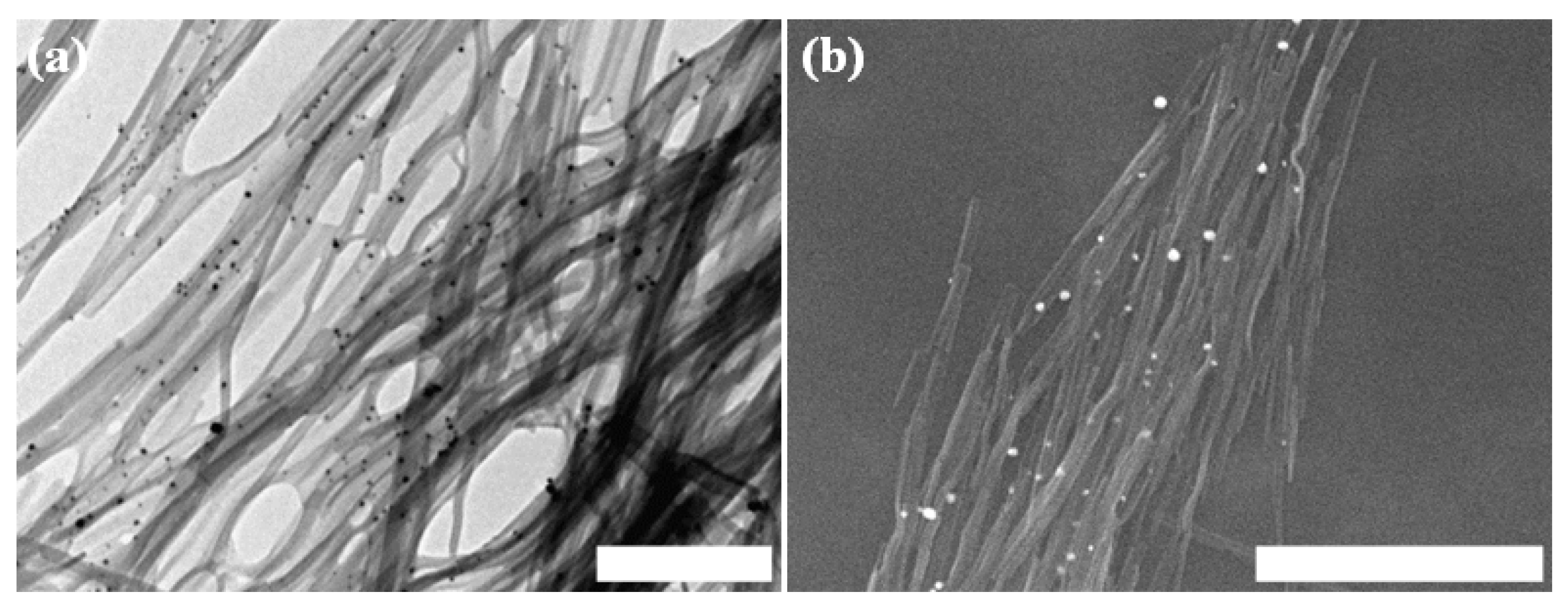Silver reduction by the Asp-DOPA-Asn-Lys-DOPA fibrillar assemblies. (a) TEM micrograph, negative staining was not applied. Scale bar represents 500 nm; (b) respective SEM micrograph, metallic coating by sputtering was not applied. Scale bar represents 2 µm.