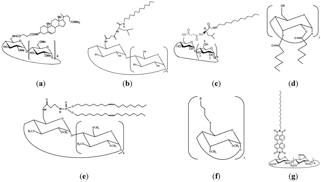 Amphiphilic cyclodextrins, monosubstituted on the primary face, have been obtained by anchoring of single hydrophobic moieties such as cholesterol, alkyl chains of variable lengths, fluorinated chains, or more complex synthetic peptidolipidyl and phospholipidyl substituents (see for instance Figure 1b,c).