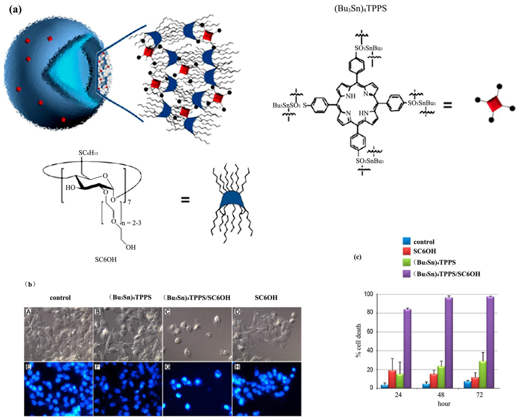 Supramolecular assemblies of amphiphilic cyclodextrins studied in vitro as potential nanotherapeutics [30]. (a) Chemical composition of the nanoassemblies of SC6OH (heptakis(2-O-oligo(ethylene oxide)-6-hexylthio)-β-CD) and (Bu3Sn)4TPPS (meso-tetra(4-sulfonatophenyl)porphine tributyltin(IV) derivative) formed in aqueous medium; (b) nuclear morphology of A375 melanoma cells treated with (Bu3Sn)4TPPS/SC6OH nanoassemblies; (c) cytotoxic effects of (Bu3Sn)4TPPS/SC6OH nanoassemblies on the A375 human melanoma cells viability. Reprinted with permission from [30]. Copyright 2013, American Chemical Society.