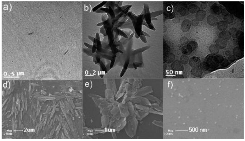 TEM (a–c) and SEM (d–f) images showing the solvent-dependent morphologies of supramolecular assemblies formed by an amphiphilic octadecylperylene-cyclodextrin derivative in mixed solvents with increasing polarity. From left to right: methanol, 4:6 water/methanol mixture, and 9:1 water/methanol mixture [38]. Reprinted with permission from [38]. Copyright 2010, American Chemical Society.