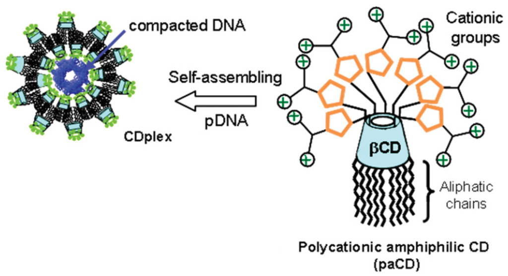 Schematic representation of polycationic amphiphilic cyclodextrins (CD) (right); which may form nanocomplexes (CDplexes) upon assembly with negatively charged pDNA (left) [80]. Reprinted with permission from [80]. Copyright (2011) American Chemical Society.