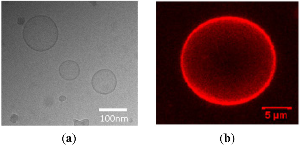 (a) Cryo-TEM image of binary vesicles consisting of a 1:1 mixture of an amphiphilic β-CD and lipids (DOPC/DOPE/Chol 50/25/25 mol%); (b) 3D reconstructed confocal laser scanning microscopy (CLSM) image of a giant unilamellar vesicle prepared from a lipid film that contains 50 mol% amphiphilic cyclodextrin (CD) (CD/DOPC/DOPE/Chol 50/25/12.5/12.5 mol%) [28]. Reprinted with permission from [28]. Copyright 2013, American Chemical Society.