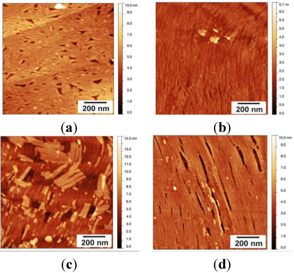 Figure 3. (a) AFM topographic scan of HOPG surface coated with a layer of EAS∆15 protein after a 50-µL drop of EAS∆15 (25 µg/mL) was incubated for 1 min and transferred onto a freshly cleaved HOPG surface; multiple protein rafts are observed; (b) AFM scan of HOPG surface coated with a layer of EAS∆15 protein after a 50 µL drop of EAS∆15 (5 µg/mL) was left to dry overnight onto a freshly cleaved HOPG surface. Sample was imaged directly after drying; (c) a 1-min wash to remove loosely bounded protein layers reveals an underlying, ordered single layer rodlet film; and (d) after 7 min of washing with a stream of running Milli-Q® water (MQW), loose fibril layers are removed and a highly ordered layer of rodlets remains attached to the HOPG.