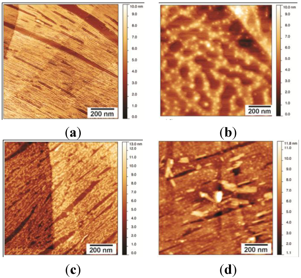 The morphology of the prepared HOPG surface was characterized at ambient atmosphere, using a Multimode Nanoscope® III AFM (Veeco, Santa Barbara, CA, USA) operated in tapping mode. The AFM probes used were silicon-scanning probes with a tip radius <10 nm, operated with a force constant of 40 N/m and resonant frequency of 300 kHz (Tap300AI-G, BudgetSensors™, Innovative Solutions Bulgaria Ltd., Sofia, Bulgaria). Analysis of AFM images was performed with the Gwyddion Software (Czech Metrology Institute, Brno, Czech Republic [32]).