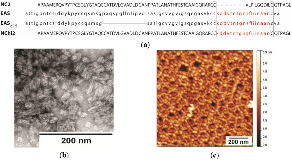 Figure 6. (a) Sequence alignment illustrating the construction of the chimeric hydrophobin NChi2 from the proteins NC2 and EAS (named for its easily wettable spore phenotype). The Cys7–Cys8 region of NC2 is shorter than the corresponding region in EAS and EAS∆15, this difference is indicated with a dotted line. The 15-residue deletion from EAS, to generate EAS∆15, is indicated by a solid line. The conservation of the amyloidogenic region between EAS, EAS∆15 and NChi2 is indicated in red; (b) TEM image of negatively stained NChi2 rodlets formed under conditions of low pH (=2.5) and elevated temperature (45 °C) with extended shaking. (c) AFM image of NChi2 dried down from pH = 2.5 at 45 °C and then washed with MQW for 5 min.