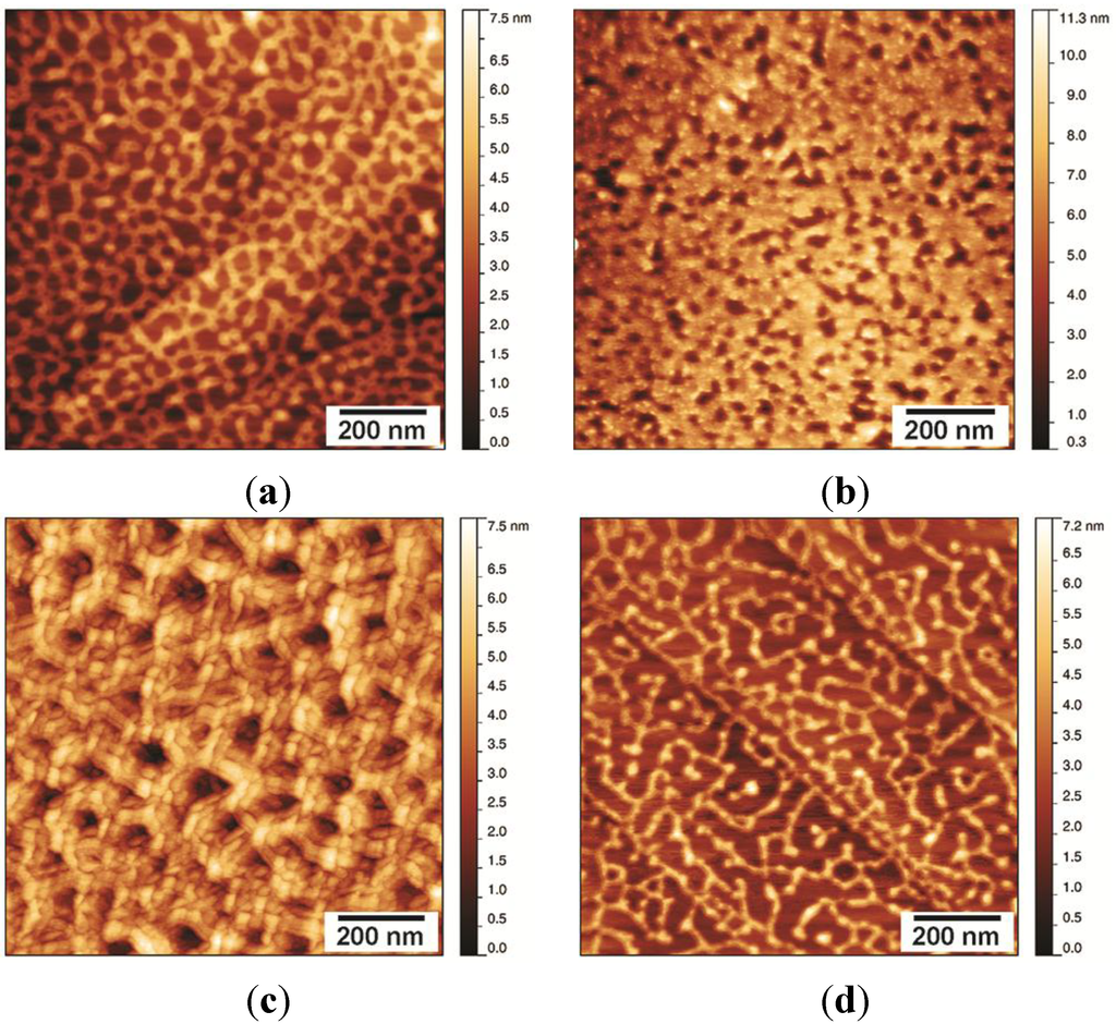 Figure 4. AFM scans of EAS∆15 rodlets on HOPG treated for 5 min with different solvents, followed by a 2-min water wash: (a) exposure to up to 100% ethanol does not affect the structure of the EAS∆15 rodlet layer and effectively cleans the surface of any loosely bound protein; (b) EAS∆15 fibrillar film is disrupted by treatment with 100% trifluoroacetic acid (TFA); fibrillar rodlet structure is stable towards treatment with: (c) 3M NaOH and (d) 3M HCl, but residual impurities remain attached to the fibrils and are not easily removed by washing.
