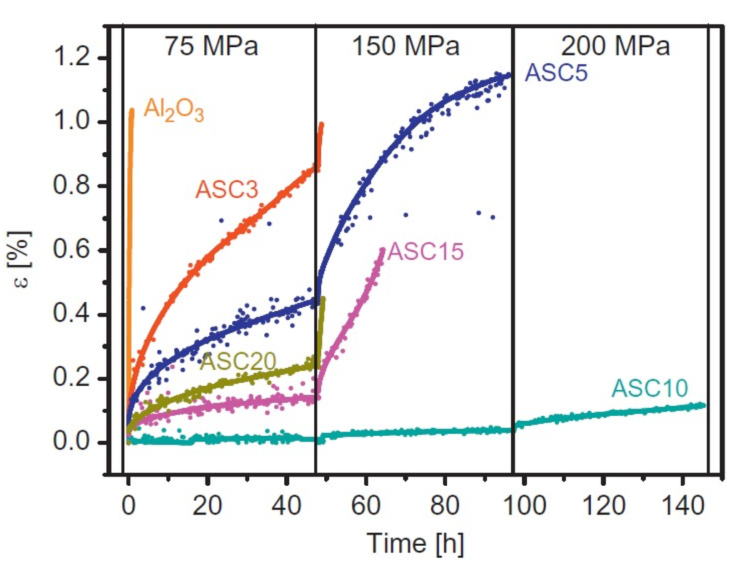 Creep deformation of Al2O3-SiC (AS) nanocomposites measured at 1350 °C and mechanical load of 75, 150, and 200 MPa. The increase of load is reflected as a break at the stress-strain curve. The number in the sample denomination represents the volume fraction of SiC in the material, i.e., AS5c represents the Al2O3-SiC nanocomposite with 5 vol% of SiC [88].