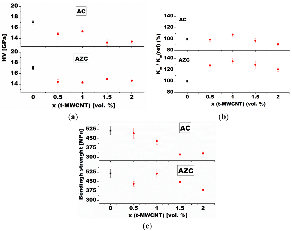 Composition dependence of (a) hardness; (b) fracture toughness; and (c) fracture strength of Al2O3-MWCNT (denoted AC) and Al2O3-ZrO2-MWCNT (denoted AZC) nanocomposites. Comparison to monolithic alumina reference [95]. Red circles represent the respective properties of nanocomposite with various volume fractions of MWCNT. Black squares represent the same property of the monolithic alumina reference.