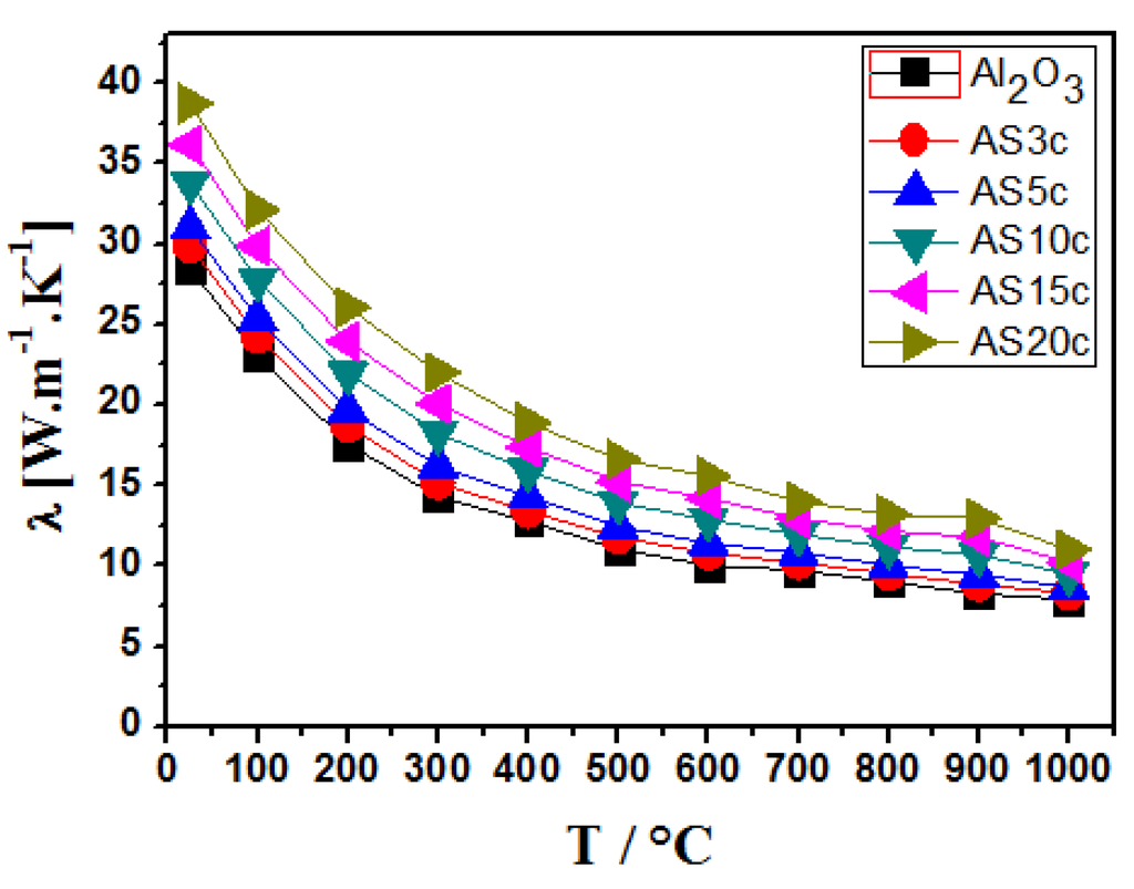 - Ahmad, K.; Pan, W.; Wan, C. Thermal conductivities of alumina-based multiwall carbon nanotube ceramic composites. J. Mater. Sci. 2014, 49, 6048–6055. [Google Scholar] [CrossRef]